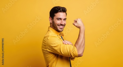 man, smiling, bicep, muscle, flexing, arm, confidence, strength, power, yellow background, positive, health, fitness, athletic, muscular, healthy lifestyle, bodybuilding, exercise, training, gym, physical exercise, determination, victory, success, achievement