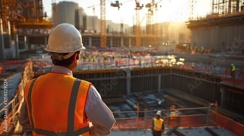 Structural engineer inspecting the foundation of a skyscraper, surrounded by cranes and construction workers on-site.