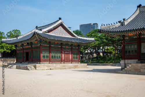 Structures in Deoksugung Palace, reflects Joseon Dynasty architecture with colorful wood frames and ornate eaves.