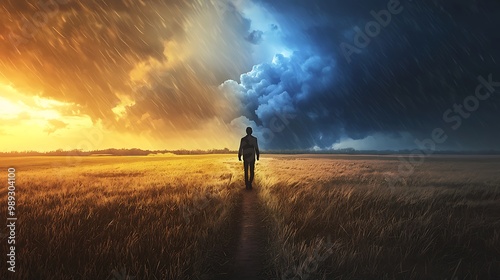 traveler, landscape, storm, peaceful, contrast, internal, battle, hardship, ease, struggle, solitude, weather, nature, countryside, journey, conflict, emotional, symbolic, challenge, resilience, hope, clear, sky, diversity, concept