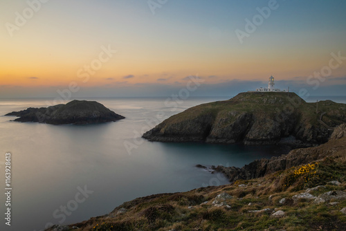 Strumble Head Lighthouse on the Pembrokeshire Coast in Wales at sunset