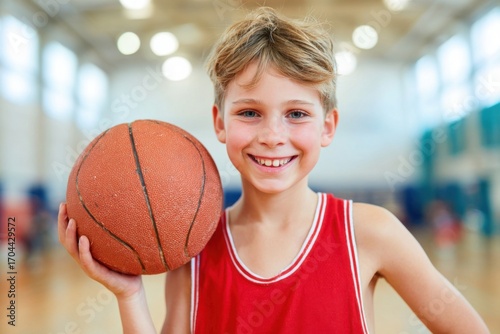 Student athlete with basketball in red jersey is smiling in gymnasium, highlighting passion for sports and teamwork in an energetic and engaging atmosphere