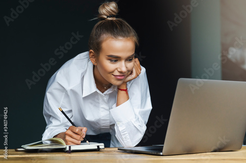 Student preparing for seminar, writing notes in copybook, searching for information online. Female working
