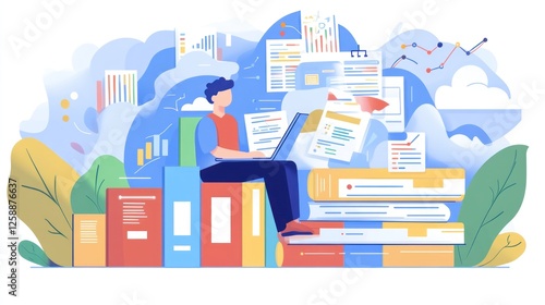 student, studying, datum, laptop, book, chart, document, information, learning, education, study, research, analysis, colourful, vibrant, dynamic, tied-up, academic, digital, technology, cognition, progress, success, growth, illustration, design, graphic, modern, flat, style, online, computer, software, program, science, business, market, strategy, marketing