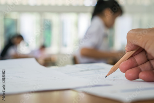 Student testing in exercise taking fill in exam at school or university in test room, document exams at campus classroom, education or back to school concept