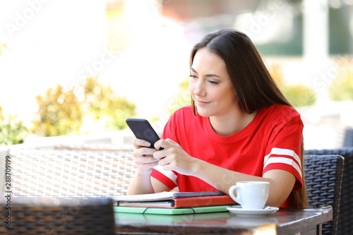student, phone, mobile, girl, smartphone, teenage, serious, school, video, checking, text, texting, message, messaging, chat, chatting, writing, text message, social, media, networking, woman, mobile phone, college, app, using, teenage, playing, game, hot drink, shop, bar, eatery, university, high, campus, young, teenage, mobile phone, online, people, share, technology, happy, distracted, looking, person, outside, holding, red