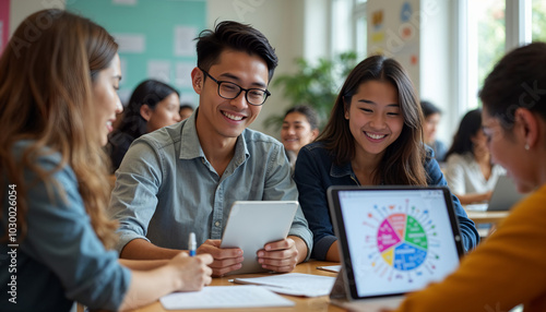 student, classroom, collaboration, project, teamwork, learning, education, technology, tablet, laptop, diverse, studying, school, university, college, higher education, cognition, skill, communication, discussion, problem solving, innovation, creativity, e-learning, stem