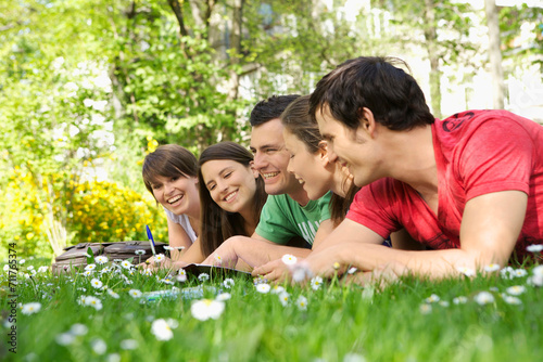 Students hanging out in a park studying and having fun.