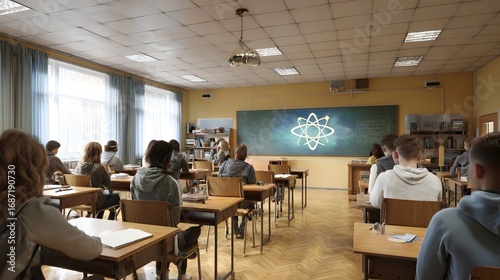classroom, student, science, atomic, model, learning, school, education, chair, blackboard, interior, room, projector, light, ceiling, shelf, book, orbit, physics, chemistry, cognition, study, attentive, seated, observing, focused, intellectual, young, academic, bright, light, natural, yellow, blue, green, wood, modern, organised, smart, curious, discovery, research, teaching, listening, pupil, indoor, academy, university, lecture