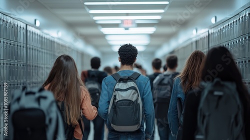 hallway, school, student, walking, locker, backpack, classroom, education, high, teenage, back, row, door, metal, grey, light, ceiling, wall, floor, corridor, line, group, youth, college, learning, people, university, locker, backpack, bag, book, student, queue, rear, backview, view, perspective, portrait, horizontal