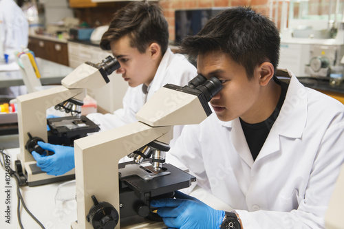 asian ethnicity, caucasian, chemistry, classmate, closeup, color image, concentration, education, examining, experiment, exploring, focusing, high school, holding, horizontal, indoor, instruction, labcoat, laboratory, learning, looking down, magnification, microscope, multicultural, people, photo, protection, research, safety, science, scientist, serious, sitting, student, teenage boy, teenage, together, two people, viewing