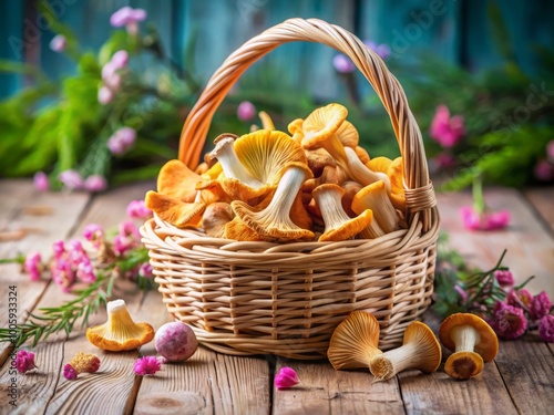 Studio Background with White and Pink Tones Featuring Raw Wild Chanterelle Mushrooms in a Basket for Elegant
