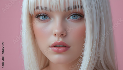 Studio beauty portrait of a gorgeous platinum blonde woman with flawless skin, showcasing perfect makeup and a serene expression against a vibrant pink backdrop.