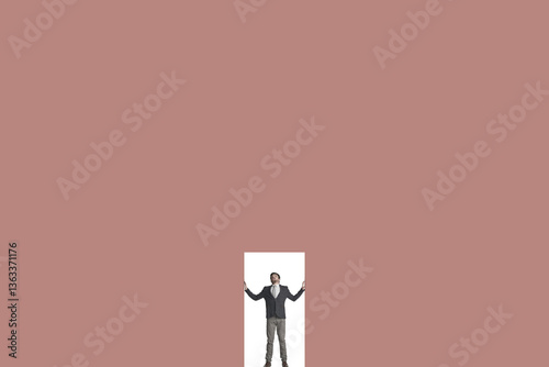 Studio, opportunity and business man with space for mockup, thinking and ideas for development promo. Poster, design and businessman with doorway for growth, inspiration or vision on pink background
