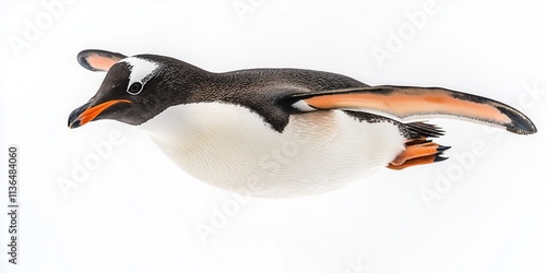 Studio photo of a flying penguin isolated against a white background. Wildlife and conservation concept, space for copy.