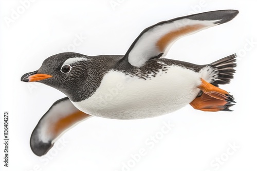 Studio photo of a flying penguin isolated against a white background. Wildlife and conservation concept, space for copy.