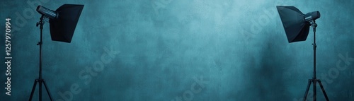 Studio Photography Setup Two Lighting Kits with Softboxes on Tripods against Teal Wall