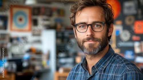 Studio Portrait Bearded Man, Glasses, Creative Workspace