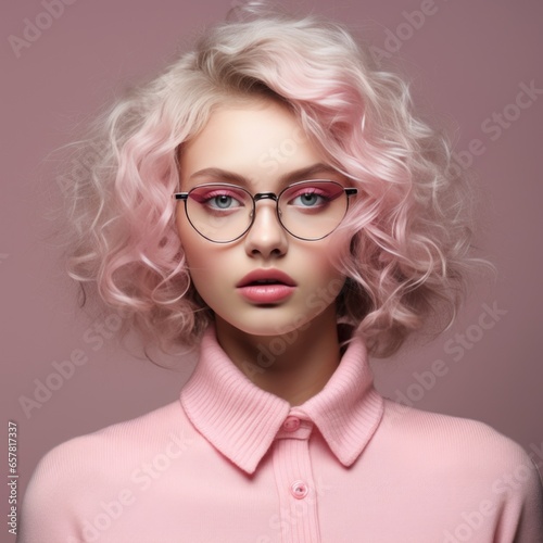 Studio portrait of a beautiful woman with a beautiful hairstyle wearing pink glasses, close-up on a dark background