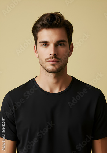 man, portrait, studio, black, t-shirt, shirt, male, fashion, model, face, serious, casual attire, attractive, photogenic, confident, calm, neutral, expression, hair, short, style, smooth, clean, pale, light, tan, skin, body, slim, toned, image, photo, portraiture, closeup, shirtless, modern, stylish, relaxed, contemporary, simple, background, solid, colours, subtile, yellow, beige, warm