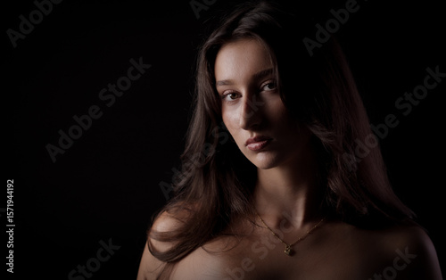 Studio portrait of attractive model posing with bare shoulders and long brown hair, creating a captivating and elegant image