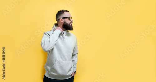 Studio portrait of handsome hipster guy with beard wearing gray blank hoodie with space for your logo or design. Mockup for print