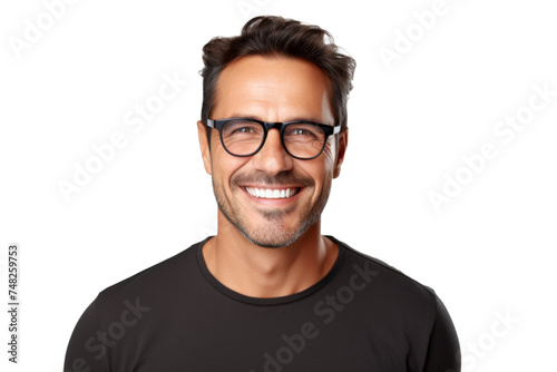 Studio portrait of handsome young Caucasian Americana man wear glasses and casual shirt with a beautiful smiling isolated on transparent png background.