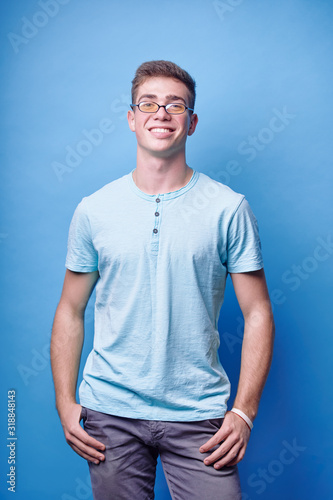 man, blue, smile, wall, colourful, colours, copy space, attractive, background, bright, casual attire, caucasian, confident, copy space, guy, photogenic, happy, lifestyle, male, modern, 1, people, person, portrait, student, studio, young, eyeglass