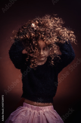 studio, portrait, small, girl, long, curly, hair, play, motion, children, children, beauty, beautiful, childhood, background, face, female, person, healthy, little, expression, adorable, fly, air, attractive, black, caucasian, cute, enjoyment, flying, happiness, quick, baby, fun, fashion, lifestyle, little girl, natural, barefoot, extremely, cheerful