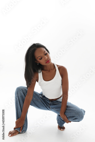 Studio portrait of young lovely woman with dark skin isolated over white wall.