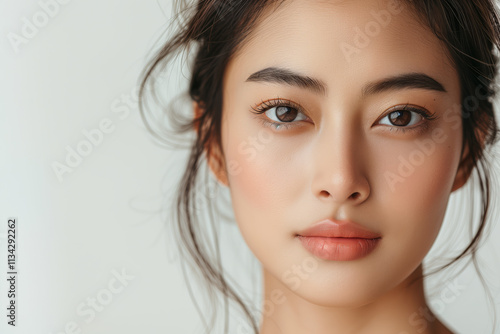 Studio portrait photo of Asian woman with beautiful facial skin with minimal make up use for skin care product commercial advertising.