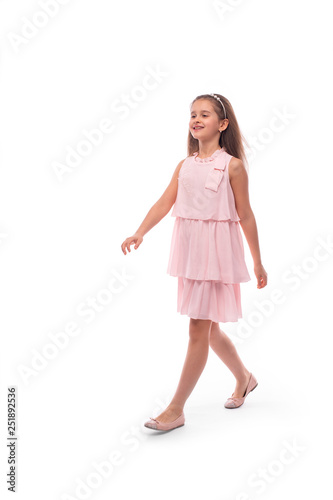 people, children, girl, schoolgirl, young, portrait, full-length, long hair, white, isolated, isolate, cute, pretty, sundress, pink, dress, go, going, smile, smiling, fun, walk, good mood