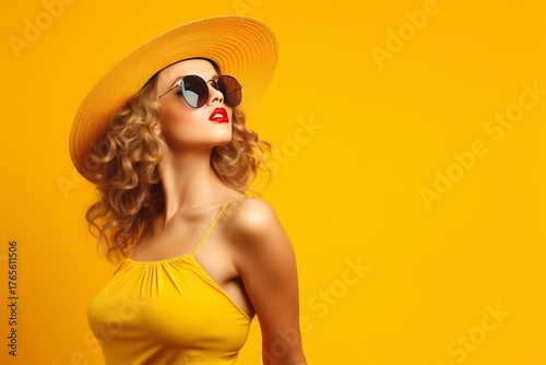 woman, fashion, red, colourful, space, modern, make-up, background, sunglasses, model, hat, beauty, clothes, summer, portrait, lipstick, yellow, dress, blond, skincare, vibrant, cosmetic, advertising, style, elegant, hair, sun, posing, outfit, studio, copy, accessory, stylish, coiffure, apparel, trendy, curly, isolated, shot, glamour, sensual, feminine, marketing, commercial, monochrome, attractive, look, trend, vogue