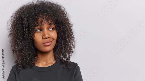 Studio shot of curly haired woman concentrated aside purses lips feels dissatisfied wears casual black t shirt being deep in thoughts isolated on white background copy space for your promotional text