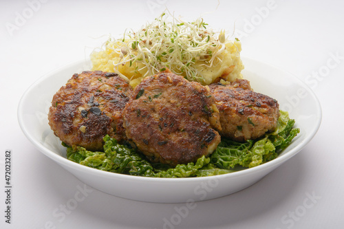studio shot of meatballs with mashed potatoes and bean sprouts as decoration against a white background