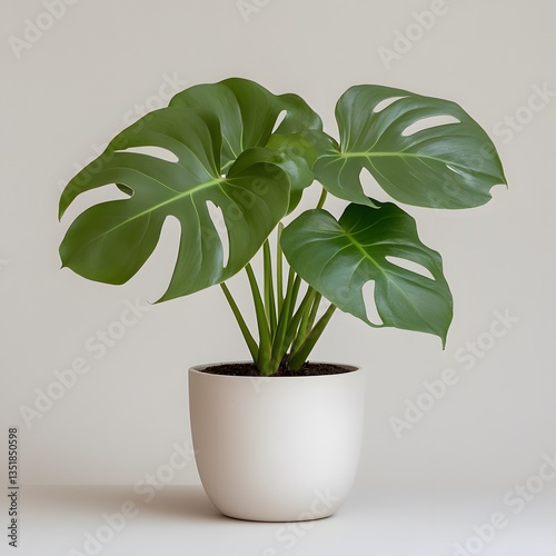 Studio shot of Monstera deliciosa in pot against neutral background; home decor