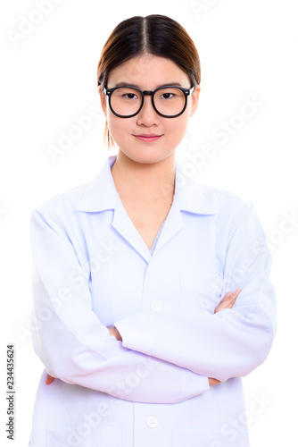 Studio shot of young beautiful Asian woman doctor with arms cros