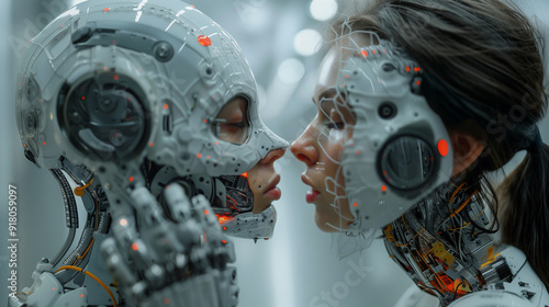 robot, woman, human, person, opposite, futuristic, together, face to face, 2, half face, profile, head, people, cyborg, intelligence, artificial, looking, future, cyber, artificial intelligence, science, machine, innovation, tech, ai, robotic, versus, work, face, technology, science fiction, communication, portrait, concept, digital, cybernetic, design, cyberspace, idea, contact, background, confrontation