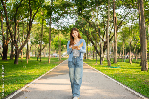 Study of portraits and female students at a university park to learn or study, scholarship books and laptops.