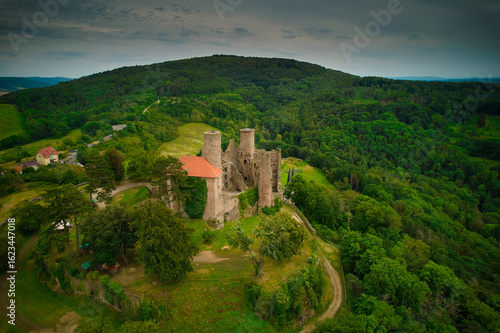 Stunning Aerial View of a Magnificent Ancient Castle Enveloped by Verdant Lush Landscapes. Hanstein castle, Germany.