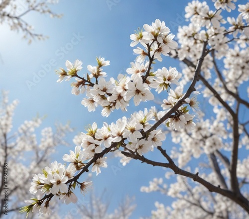 stunning almond tree branches with vibrant white flowers against a hazy blue sky out of focus in the background with empty space at center, springtime blossoms, flower bloom, serene scene