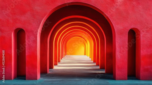 Stunning Architectural Symmetry Red Arches Leading to Bright Orange Light Tunnel Perspective Abstract
