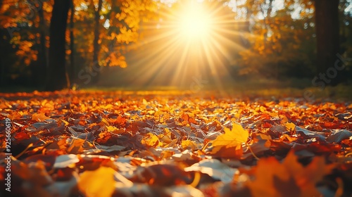 Stunning Autumn Forest Scene with Sun Rays Piercing Through Foliage, Colorful Leaves Covering the Ground, Capturing the Essence of Fall in a Serene Woodland Setting. Nature's Splendor in a Sunny Day P