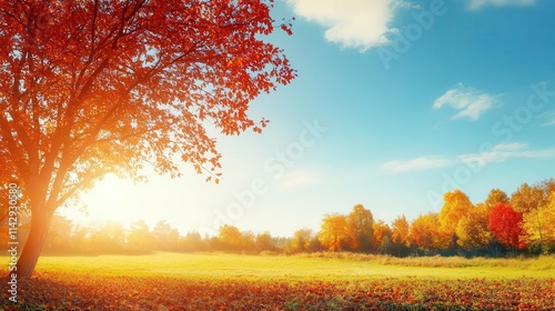 stunning autumn park scene featuring vibrant red and yellow maple trees against a brilliant blue sky, inviting viewers into a peaceful natural landscape