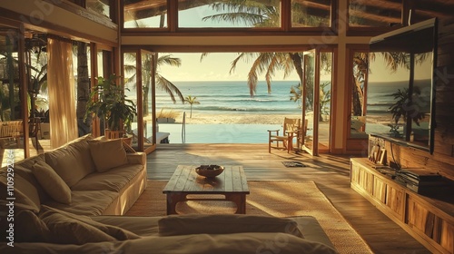 beach, house, ocean, view, sunset, tropical, coastal, living, modern, design, relaxation, room, open, concept, glasses, door, palm, tree, interior, decor, wooden, furniture, warm, tone, nature, peaceful, retreat, home, roomy, inviting, calmness, vacation, rental, summer, life, scenic, view, natural, light