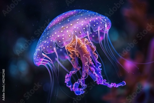 jellyfish, deep sea, underwater, marine life, glowing, vibrant, ocean, marine animal, aquatic, tentacle, mesmerizing, nature, sea, purple, blue, aethereal, luminescence, beauty, underwater photography, oceanography, shimmering, mysterious, semitransparent, wildlife, swimming, oceanic, fascinating, sea fauna, photogenic, picturesque, captivating, surreal, enchanting