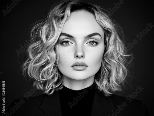 Stunning blonde woman with wavy hair in high contrast monochrome portrait striking confident expression strong cheekbones intense gaze contemporary editorial fashion style