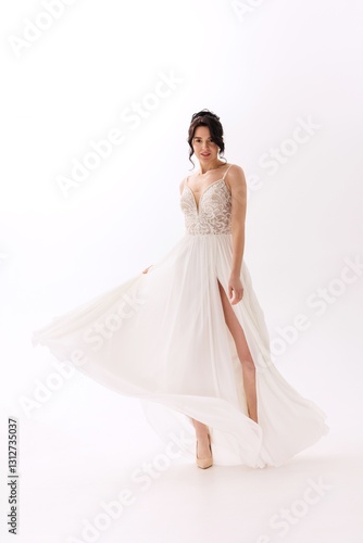 Stunning bride in elegant gown showcases beauty and grace during a wedding photoshoot in a minimalist studio