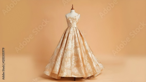 Stunning Bride's Golden Maxi Frock with Formal Long Gown Design, Perfect for Prom, Weddings, and Special Occasions, Elegantly Displayed on a Mannequin Against an Isolated White Background, Featuring L