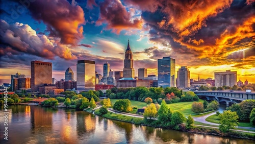 cleveland, skyline, city landscape, art, vibrant, colours, cloud, dusk, sunset, architecture, urban, landscape, modern, building, photo, panoramic, scenery, travel, tour tourism, ohio, waterfront, river, horizon, night, illumination, artistic, creative, design, contemporary, metropolis, city lights, scenic view, downtown, beautiful, colourful, visual, abstract, graphic, silhouette, panoramic view, atmospheric, urban art, city skyline